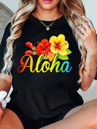 Vibrant Aloha Hawaiian Floral Print Short-Sleeve T-Shirt - Tropical Hibiscus Design, Lightweight & Comfortable Fabric, Machine Washable, Perfect For Casual Wear | Women's Fashion, Everyday Comfort Tee | Vibrant Casual Top | Lightweight Printed T-Shirt