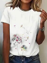 Women's White Cotton Loose Fit Round Neck T-Shirt With Vibrant Dandelion Floral Graphic Print - Breathable Casual Short Sleeve Top For Spring/Summer Daily Wear & Parties, Relaxed Fit Tee | Natureinspired Design | Pure Cotton Printed T-Shirt