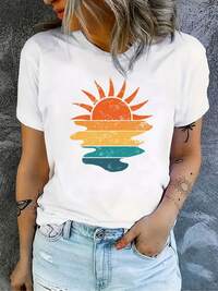 Camiseta de manga corta con estampado gráfico para mujer talla grande - "SÉ EL SOL EN LA VIDA DE ALGUIEN HOY" Estampado frontal y trasero, de algodón transpirable, cuello redondo casual para primavera, verano y otoño, lavable a máquina, camisetas para damas, ropa casual cómoda, camiseta gráfica alegre, ropa con tema de sol, camiseta de tela suave