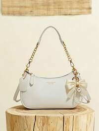 This Women's Shoulder Bag Is Made Of Solid Color PU Material, Decorated With Letter Accents, Bow, And Pearl Pendant, Exuding A Fashionable Vibe. The Bag Features A Zipper And Metal Chain Design, Making It Stylish And Versatile. It Can Be Easily Worn Across The Body To Elevate Your Overall Look. The Spacious Interior Can Accommodate Daily Essentials Like Lipstick, Keys, Cosmetics, Etc., Suitable For Commuting, Outings, Dates, Shopping, And Various Everyday Occasions For Women., Cream Bag #3 Bestseller