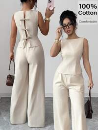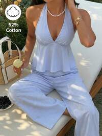 SunnyshicSunnyshic Conjunto de 2 piezas de camiseta de tirantes con cuello en V profundo y espalda descubierta con volantes en el bajo y pantalones rectos de pierna ancha de cintura alta de tela de algodón a rayas azules, para mujer, primavera-verano, vacaciones, playa, oficina, elegante, lindo, romántico, minimalista, casual, versátil