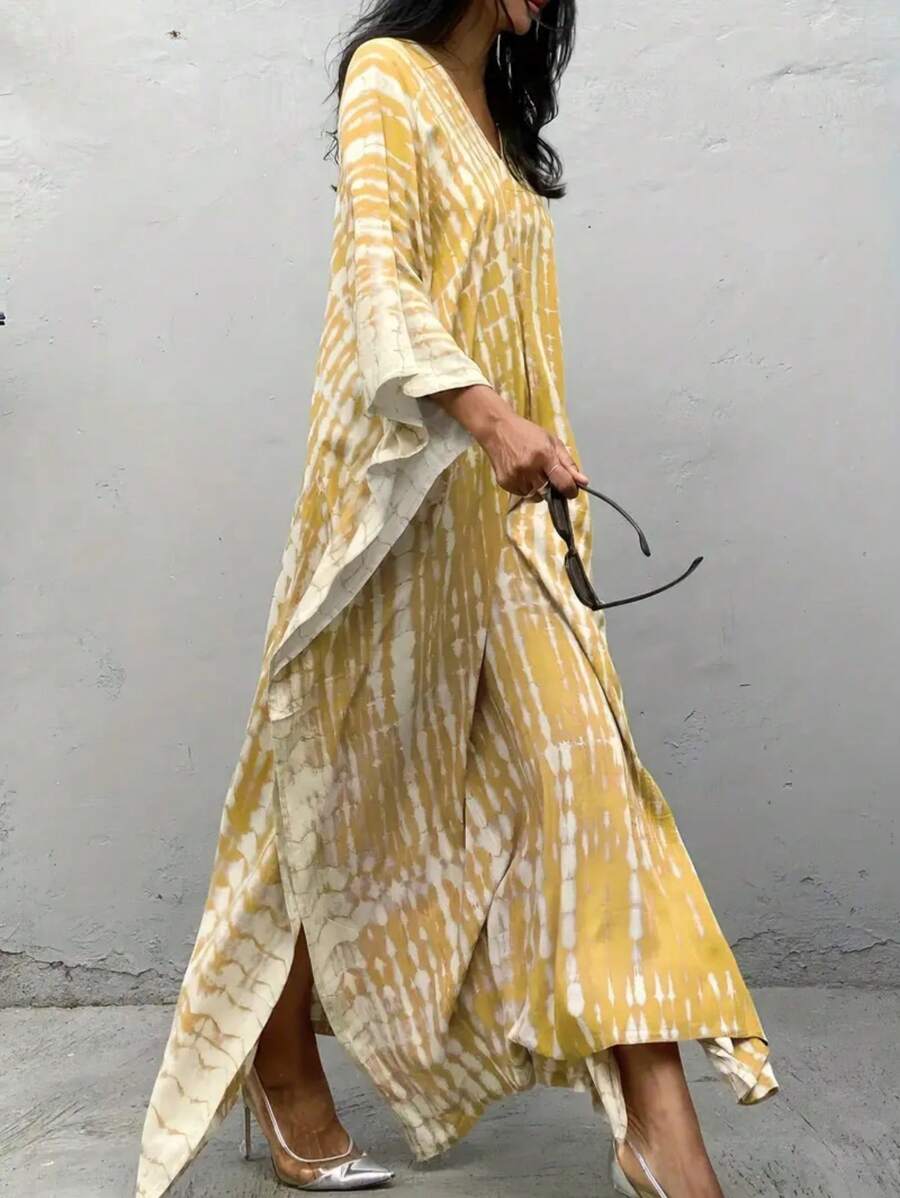 Women's Plus Size Boho Style Cover Up, V-Neck Tie-Dye Loose Vacation Beach Long Cover Up Dress