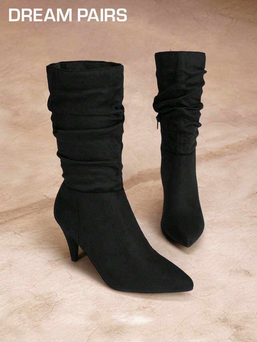Women's Stiletto High Heel Pointed Toe Suede Mid Calf Boots For Fall/Winter, Classic Slouchy Soft Comfortable Boots