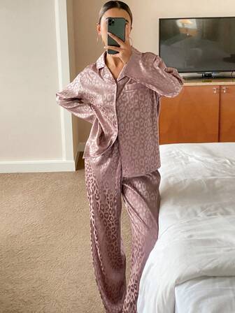 DAZY 2pcs Satin Leopard Jacquard Loose Long Sleeve & Pants Pajama Set For Women