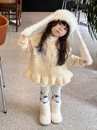 DAZY Infant/Toddler Girls' Round Neck Bow Contrast Color Embroidery Long Sleeve Ruffle Cardigan