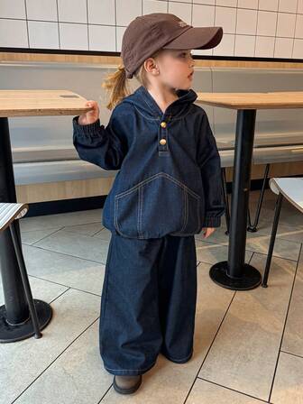 DAZY 2pcs Young Girl Girls Casual Loose Denim Top And Straight Leg Pants Set, Autumn