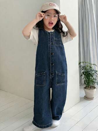 DAZY Young Girls Denim Bib Pants And Jumpsuit, Round Neck Casual Vintage Korean Style