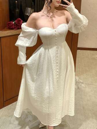DAZY Women's Elegant Solid Color Square Neck Gigot Sleeve Long Dress, Spring/Summer