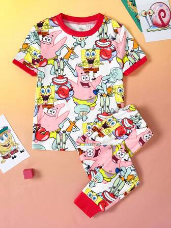 SpongeBob SquarePants | SHEIN 2pcs Baby Girl Cute Polka Dot Cartoon Pattern Round Neck Long Sleeve Top And Pants Pajama Set