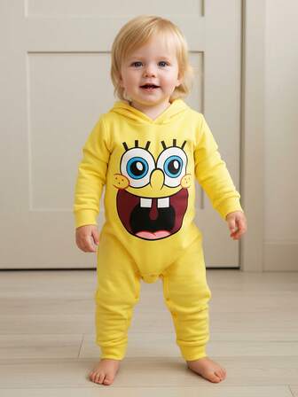 SpongeBob SquarePants | SHEIN Baby Boy Cute Cartoon Pattern Long Sleeve Hooded Knitted Jumpsuit, Yellow Fall Winter