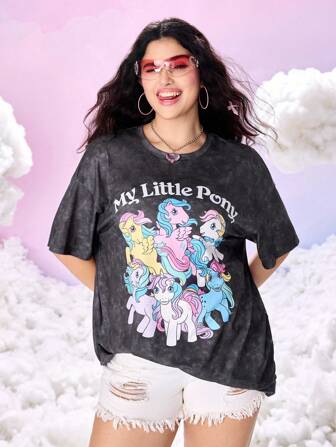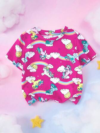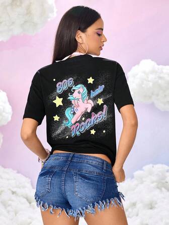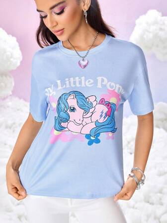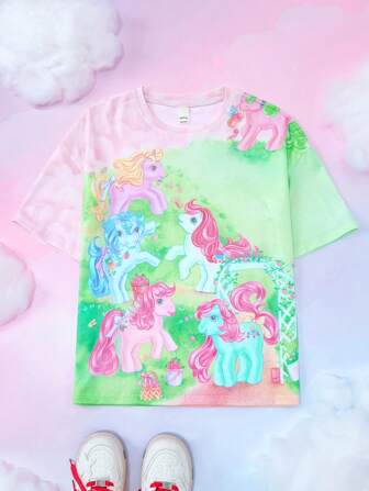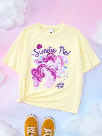 My Little Pony X SHEIN Tween Girls' Casual Cute Cartoon & Letter Print Loose Fit Short Sleeve T-Shirt, Summer