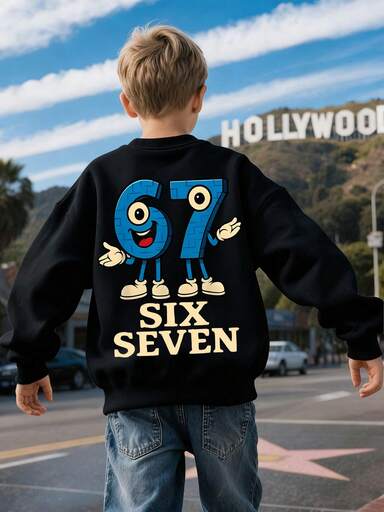 67 Cartoon Print Crewneck Sweatshirt, Autumn And Winter Children's Fleece Sports Sweater, Suitable For Boys And Girls For Daily Commuting, School, And Casual Sportswear. Long-Sleeved Top, Perfect For Holiday Parties, Outdoor Activities, And Travel.