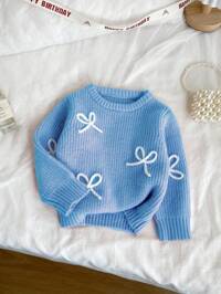 Vintaside KidsSHEIN Vintaside Kids Infant & Toddler Girls' Embroidered Pink Pullover Sweater, Suitable For Spring/Autumn, Can Be Worn As Layering Piece In Cold Winters. Delicate Bow Embroidery Adds Adorable And Playful Charm. Suitable For Family Gatherings, Halloween, New Year, Thanksgiving, Christmas, Easter, National Day, Parties, New Year's Eve Baby Blue Knitted Sweater Baby Bow Sweater Baby Jumper Knitted Baby Clothes Baby Boy Sweater Baby Knit Jumper Baby Knitted Sweater Blue Baby Sweater Fall