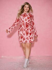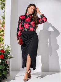 LYSMOSHEIN Clasi Plus Size Women's Floral Print Woven Shirt With Cut-Out Detail And High Waist Split Hem Skirt 2 In 1 Set, Elegant For Valentine's Day, New Year, Thanksgiving, Christmas, Easter, Prom, New Year's Eve, Christmas Party, Christmas Decoration, Christmas Home Outfit SHEIN Clasi Women Plus Size Heart Pattern Batwing Shoulder Loose Elegant Blouse One Shoulder Top, Suitable For New Year, Valentine's Day, Thanksgiving, Christmas, Easter, Party, New Year's Eve, Christmas Party, Christmas Decoration, Christmas Pajamas