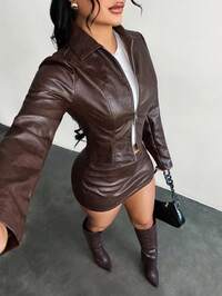 SHEIN SXY Street Style Reversible Zip-Up Leather Jacket,Leather Jacket,Zipper,Fall,Winter,Brown,,Fall Clothes For Women,Cropped Jacket,Punk,Streetwear