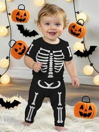 SHEIN Baby BoyGlow In The Dark Skeleton Pajamas Set - Halloween Costume Sleepwear For Kids, Snug Fit Cozy PJs Baby Boy Baby Skeleton Outfit Baby Halloween Clothes Baby Spooky Clothes Skull Baby Clothes Baby Horror Outfits