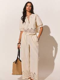 PoésellePoéselle Conjunto de dos piezas de algodón blanco estampado, estampado azul, diseño con abertura a ambos lados, tela cómoda y transpirable, conjunto de 2 piezas de top tipo camiseta y pantalones estilo retro para mujer, atuendo casual de verano, adecuado para uso diario, salir, ir al trabajo, citas, vacaciones y otras ocasiones