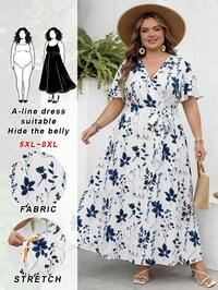 SHEIN CURVE+SHEIN CURVE+ Vestido holgado con cordón y estampado floral grande de estilo retro casual, adecuado para primavera/verano, tallas grandes, vacaciones Hoho, vestido fluido, vestidos de verano para mujer, atuendos de playa, vestido de playa, atuendos de vacaciones de playa, accesorios de playa, graduación, vestido de fiesta de té, verano, campo, vacaciones de playa, atuendos de playa, ropa de playa