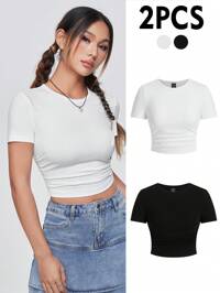 SHEIN Qutie 2pcs Set Casual Black & White Crew Neck Short Sleeve Fitted T-Shirts For Women, Summer Suitable For Going Out