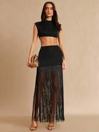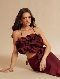 SilqueeSilquee Women's Deep Red Elegant Three-Dimensional Floral Vest, Full-Flower Vest, Ruffled Floral Cropped Camisole Paired With A Fishtail Maxi Skirt Two-Piece Set; Suitable For Carnivals, Parties, Elegant Banquets, Wedding Guests, And Luxurious Evening Gowns. This Strapless Two-Piece Set Is Also Suitable For Dates, Graduation Ceremonies, Concerts, Bridesmaid Dresses, Weddings, And Romantic Occasions. Simple Style, Elegant For Everyday Wear. Asymmetrical White Dress Set, Slip Dress Set;