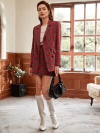 SHEIN Privé Conjunto de blazer y falda de doble botonadura con cuello entallado a cuadros para otoño/invierno