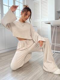 SHEIN EZwear Drop Shoulder Rib Knit Crop Tee & Drawstring Waist Pants